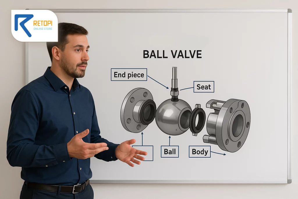 توپ در مرکز شیر قرار دارد و با یک چرخش ۹۰ درجه، جریان را قطع یا وصل میکند. توپ معمولاً از فولاد ضدزنگ یا آلیاژهای مقاوم ساخته میشود. کیفیت ماشینکاری توپ، نقش مستقیم در آببندی و کاهش گشتاور دارد.